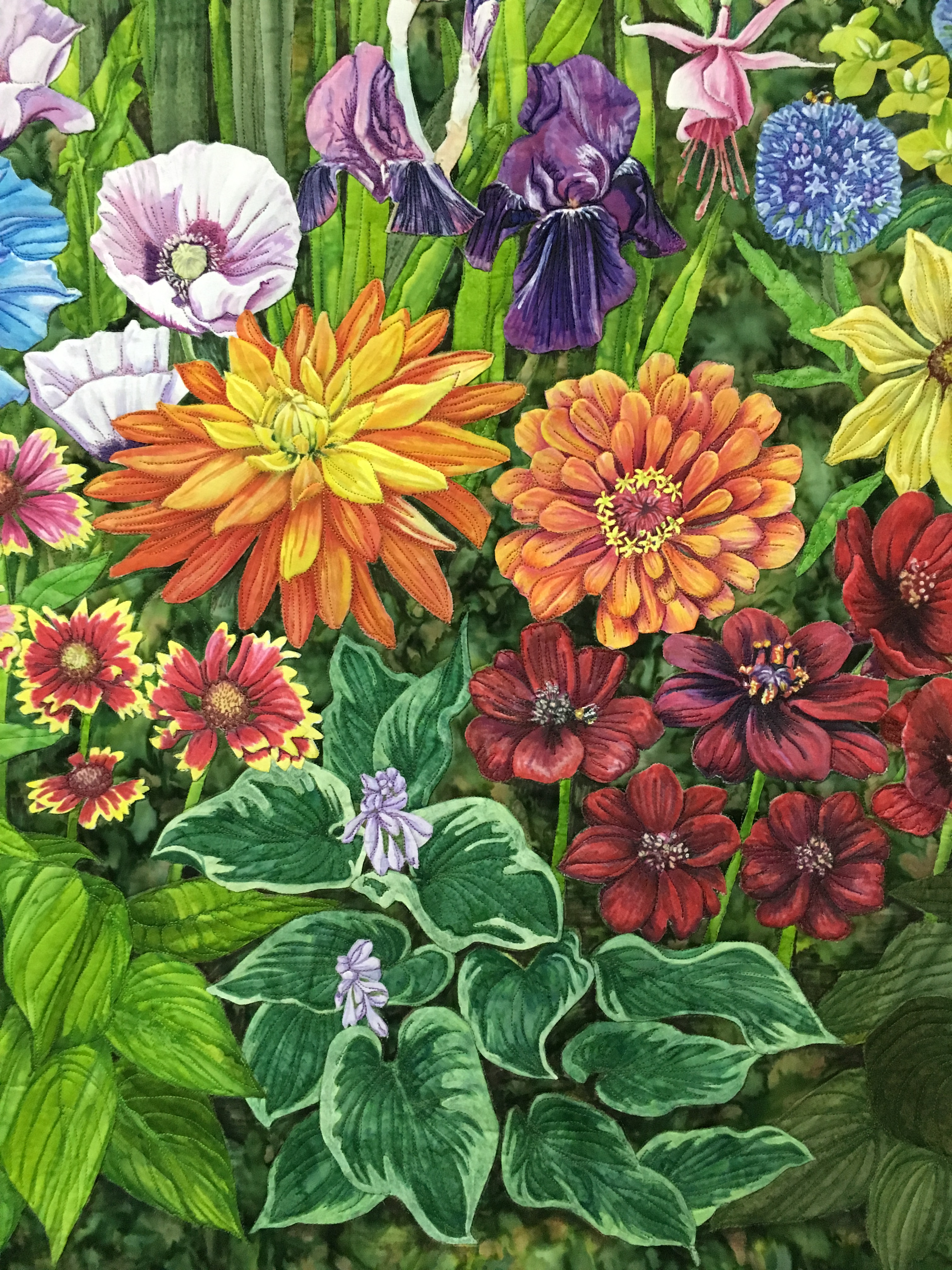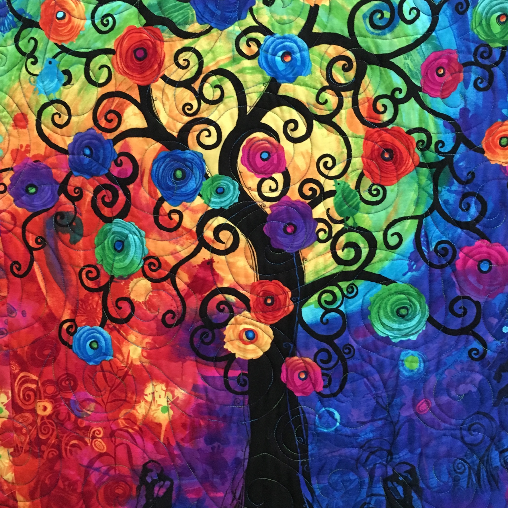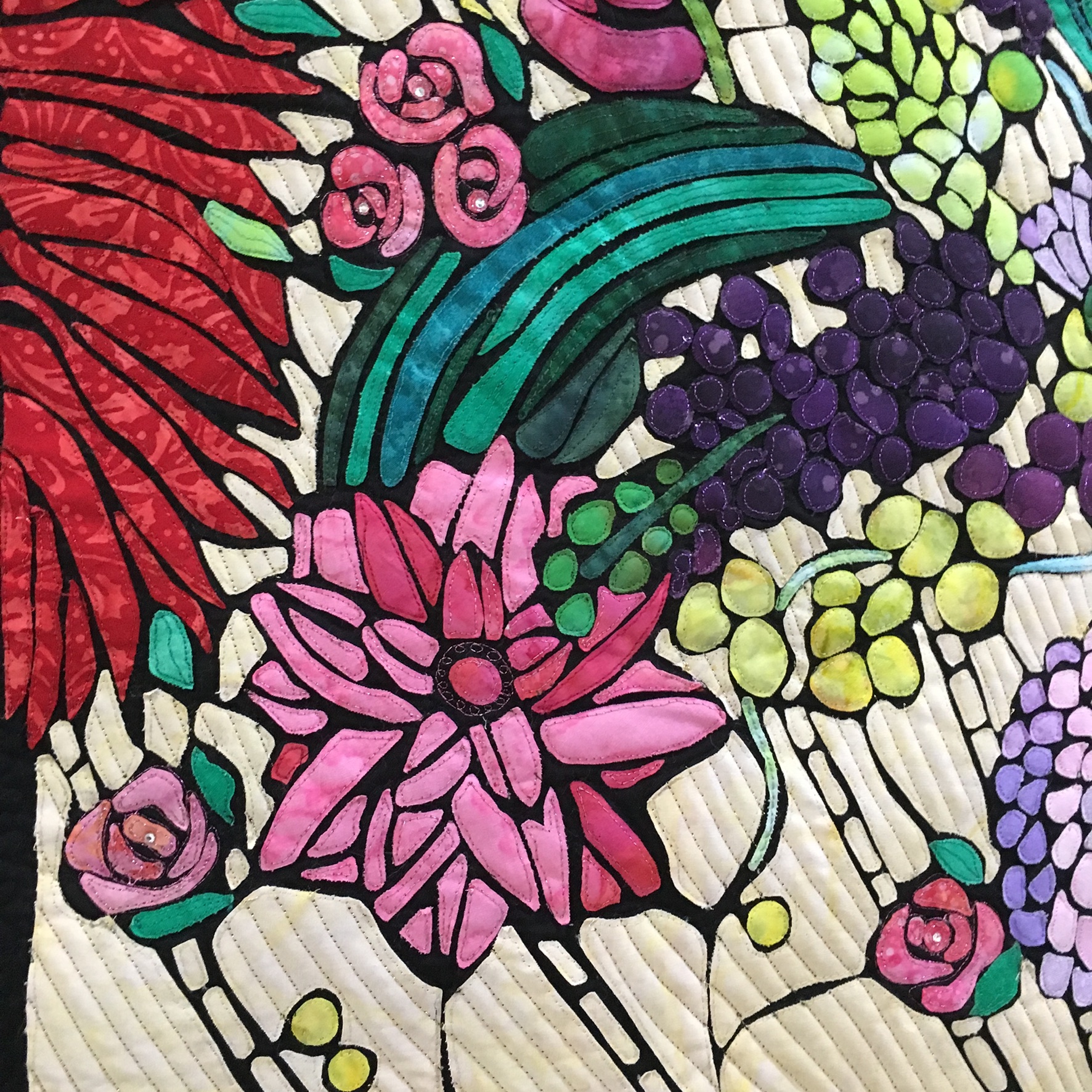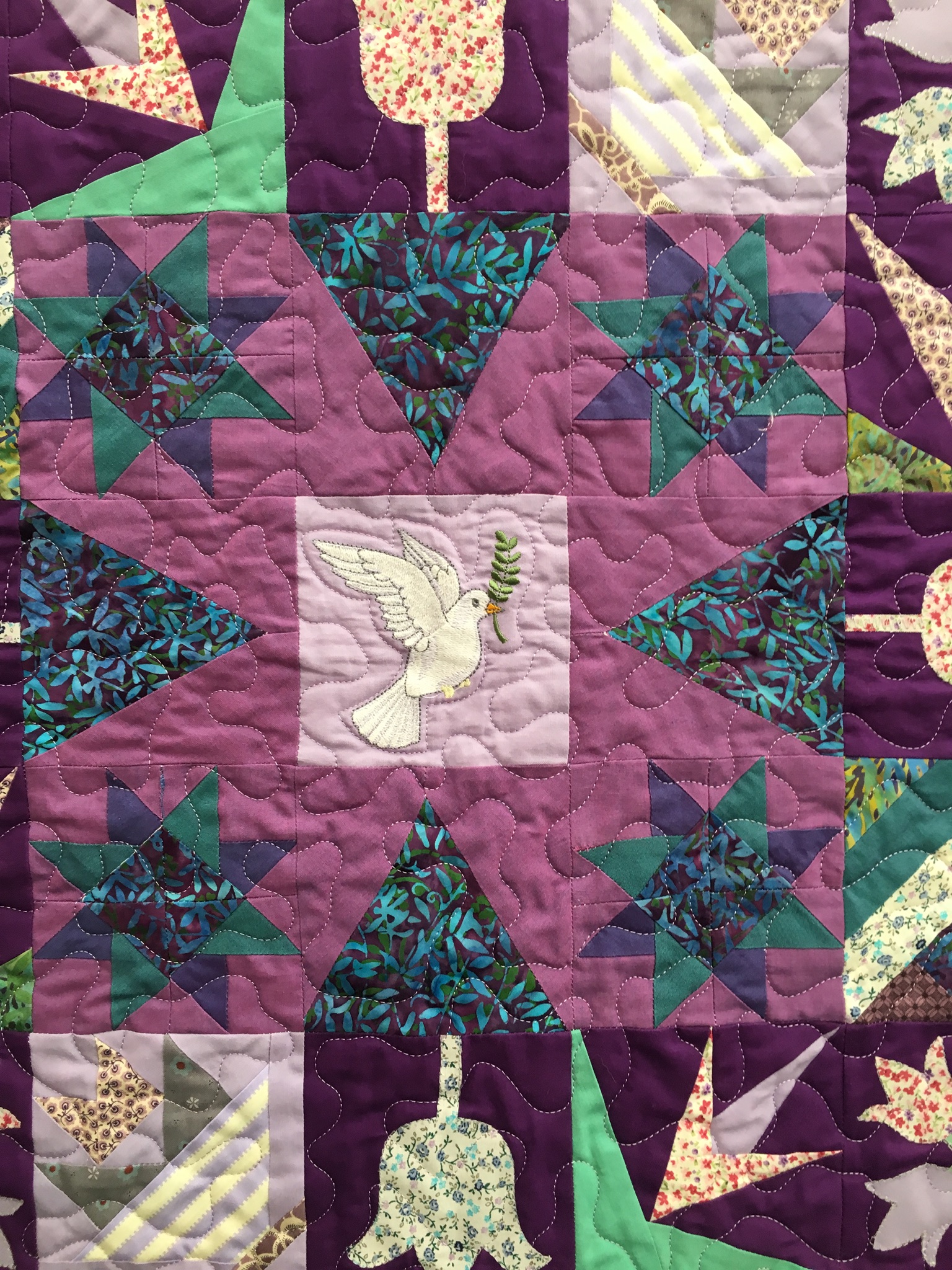 The quilt displays were well organised and allowed room to see them although at a few I settled into practising patience in order to get clear pictures. I also got a chance to say hello to Angela Attwater who was demonstrating Westelee Rulers on Cotton Patches stand. I passed by her demo several times but it was always surrounded by a number of interested ladies, but just before leaving I caught her on a break. I must book onto one of her courses as we have had the Starter Set of Rulers for two years now. I also went back to get a photo of her newest published quilt design Cherry Blossoms.