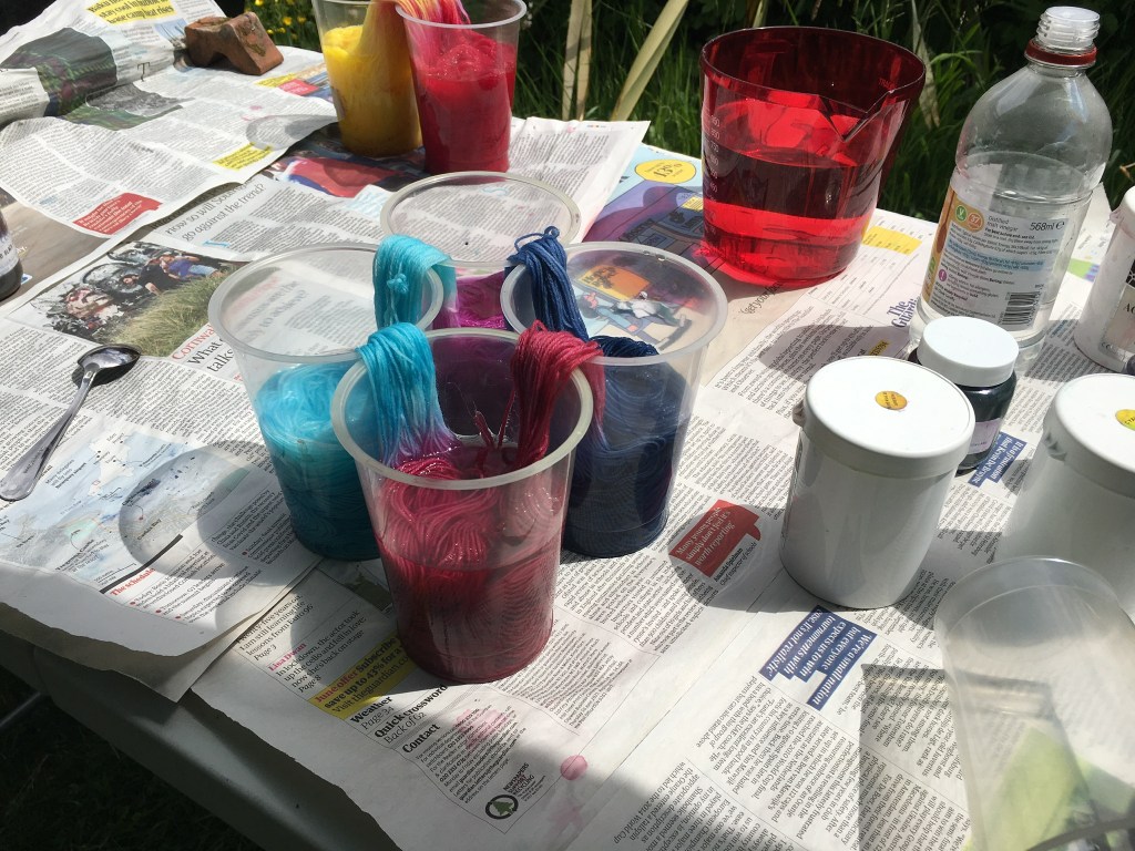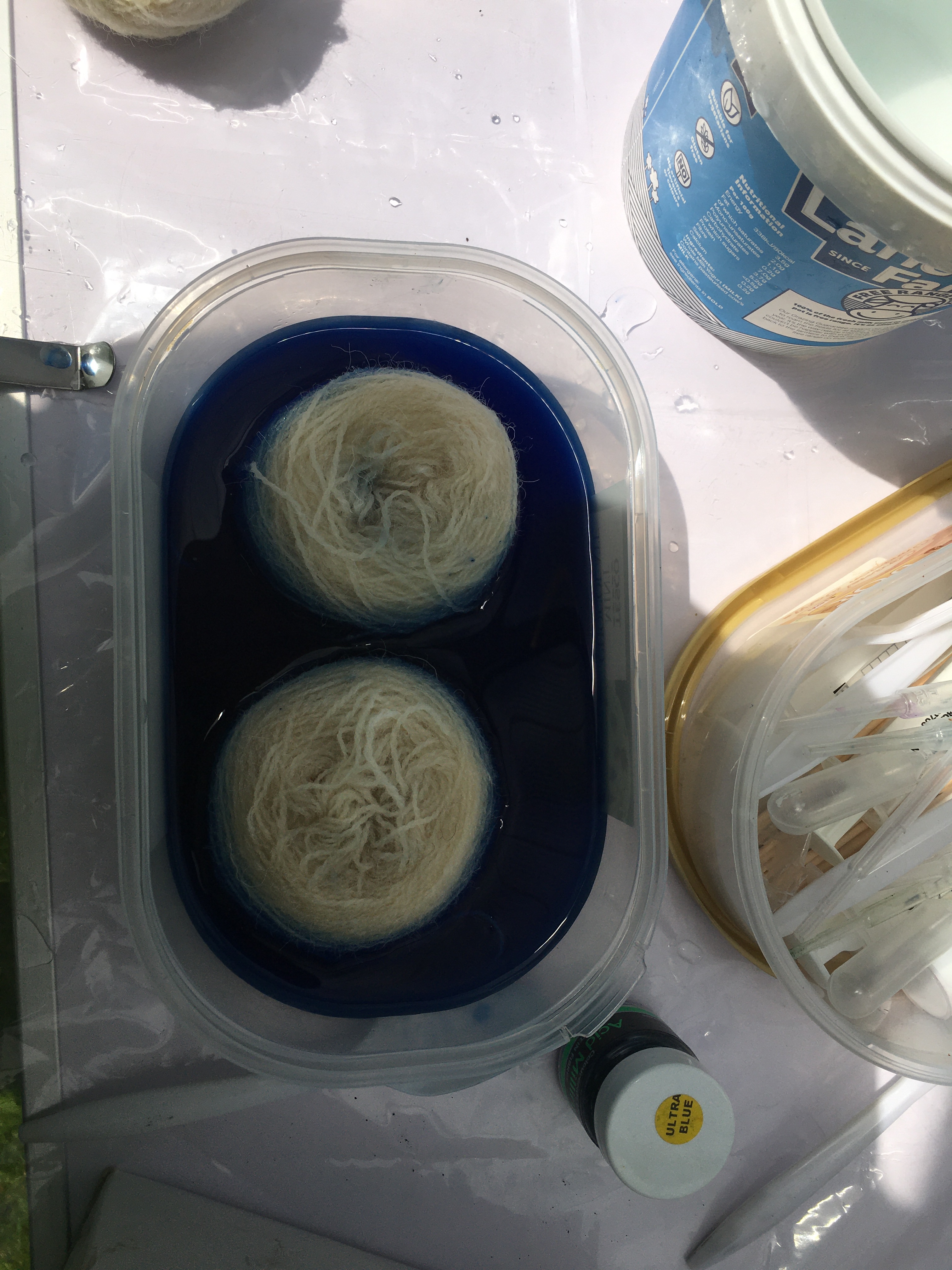 The yarn cakes are dyeing in ice cream tubs having been pre-soaked in vinegar and water to open the fibre. I didn’t really pre-plan the colours but just had a play to see what happens as my first try.