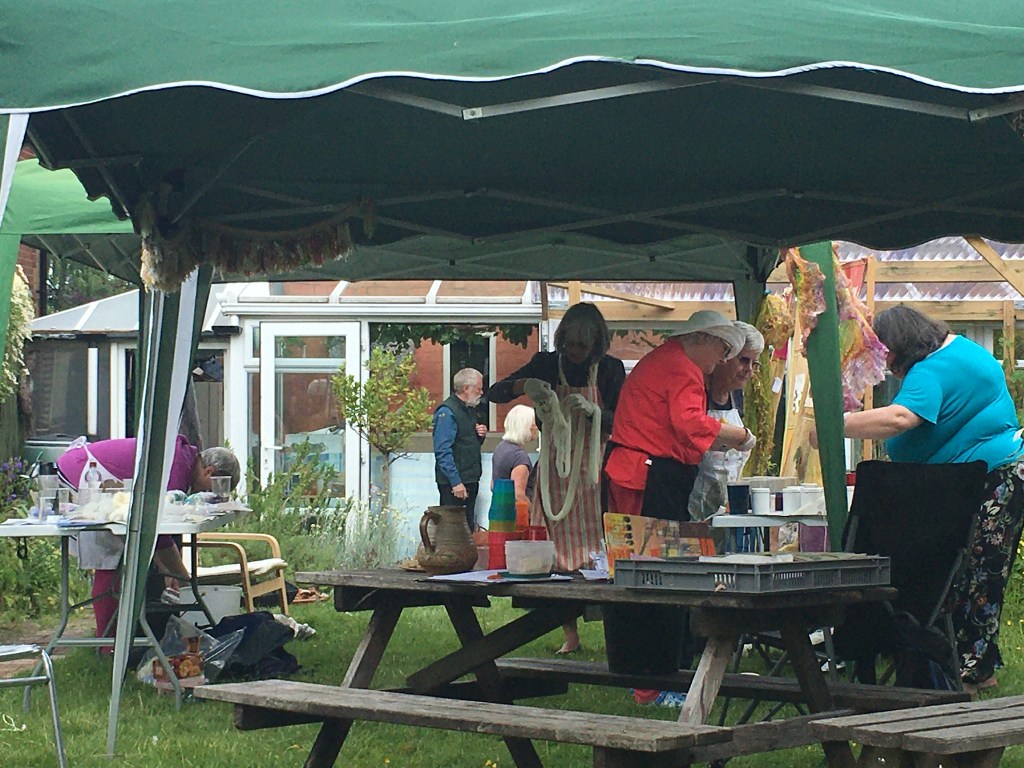Now that the we are beginning to come out of isolation and can meet up outdoors in larger groups the local guild members met up for our biennial dyer’s picnic in Sarah Cage’s garden. Eleven of us made it with some visitors joining in.