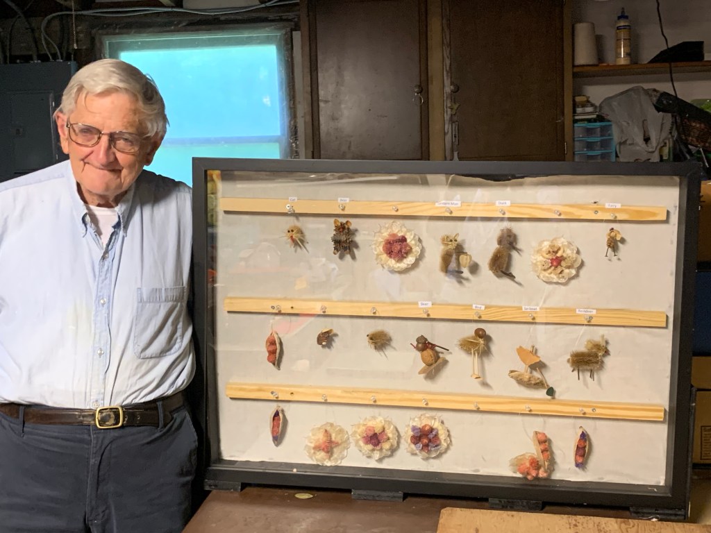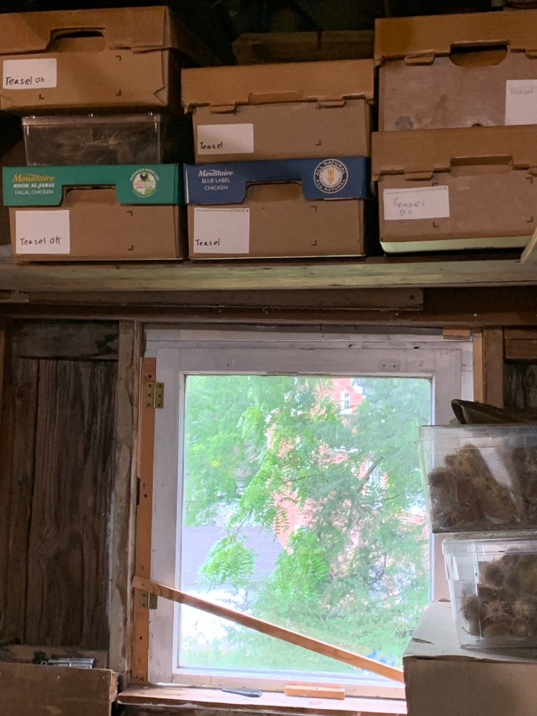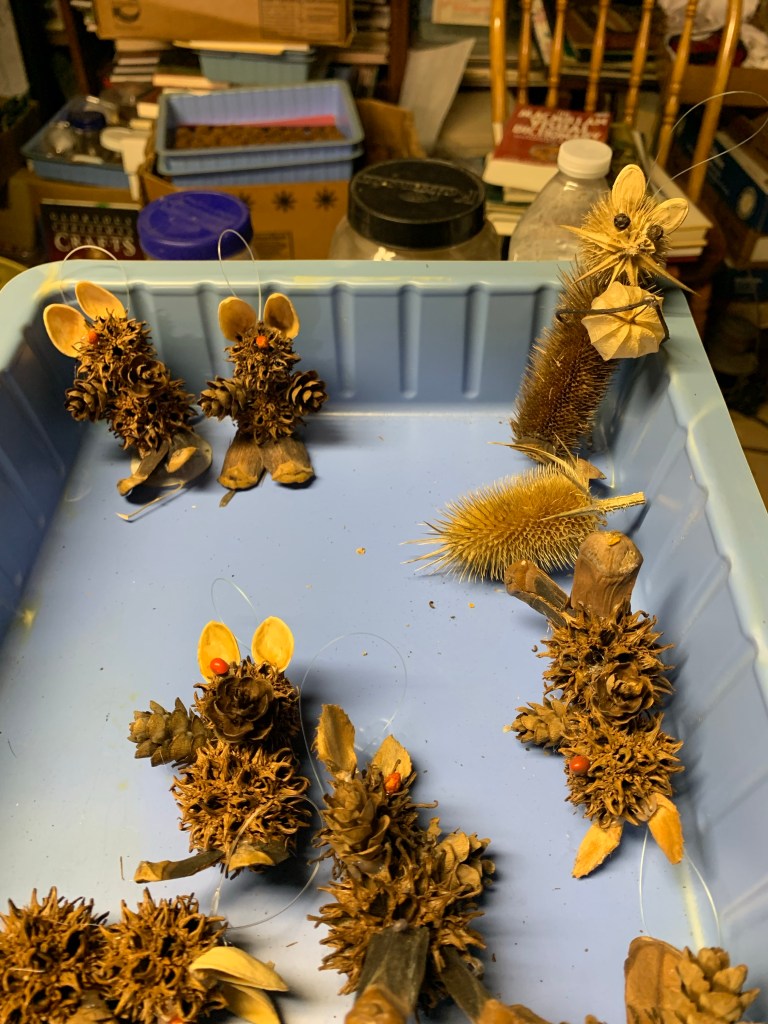 In another building on the site Bobby has a workshop for making small ornaments for Christmas trees which the historical society sell in the autumn and winter. He gathers all the seed pods, teasels, and sticks he uses from the surrounding fields, boxes them up for storage until he makes the ornaments.